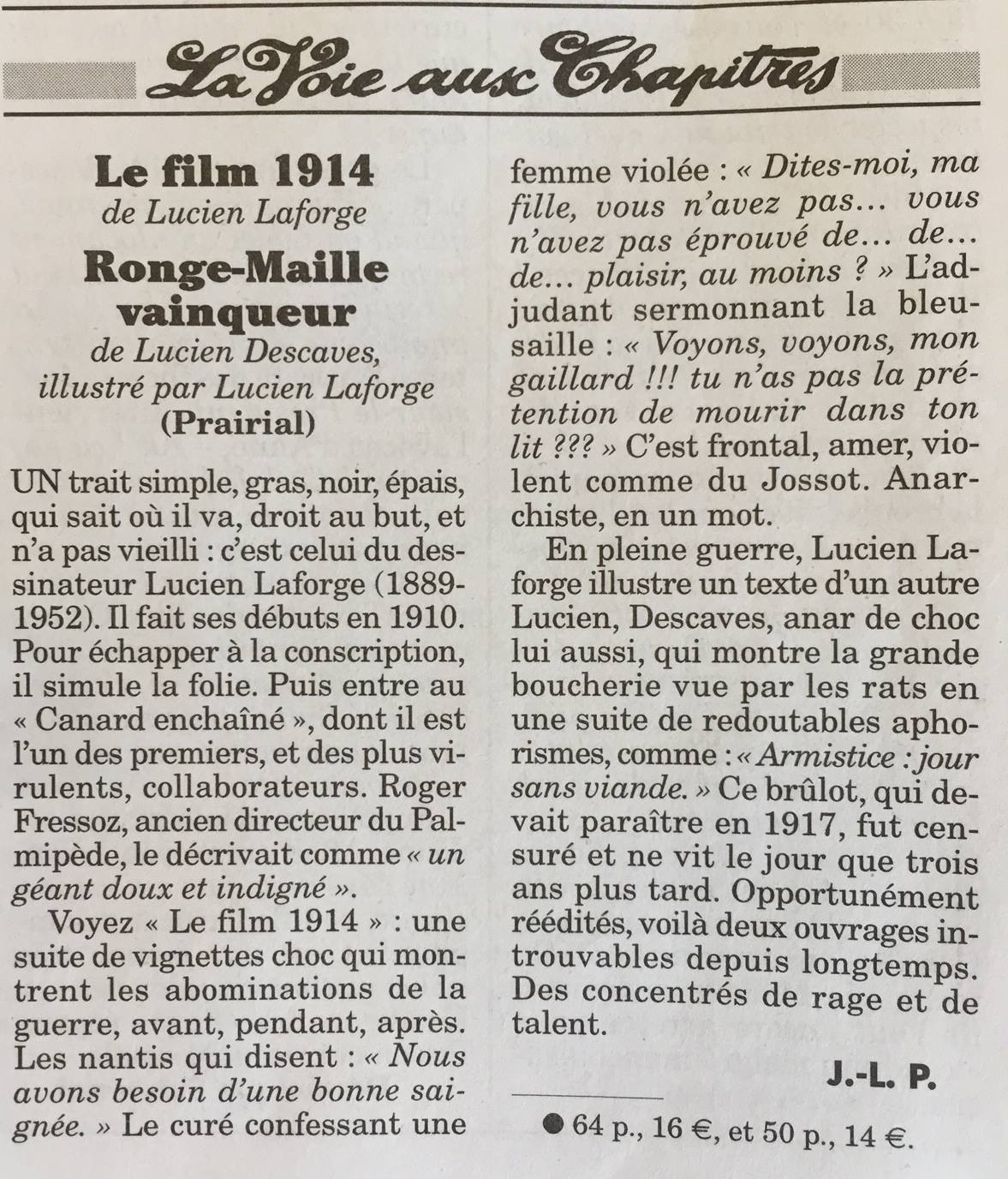 « Lucien Laforge martèle la “comerie” générale en s’appuyant sur des dessins stigmatisant les foules à front de bête, les bourgeois ou les mercantis assis dans leur cynisme satisfait et leur bêtise crasse. »Éric Dussert, L’Alamblog.